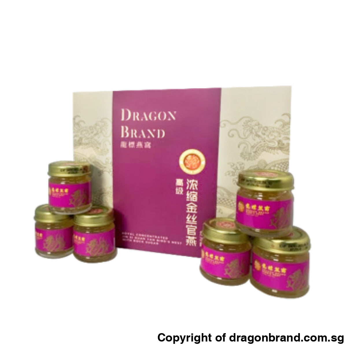 Dragon Brand Royal Concentrated Jin Si Guan Yan Bird's Nest with Rock Sugar is prepared using high quality Bird's Nest and refined rock sugar. Our specially developed manufacturing process, which is HACCP certified, is safe and hygienic. The product is vacuum-sealed in a glass bottle and put through an advanced process for sterilisation entirely by heat, without any artificial preservatives, colouring or flavouring.