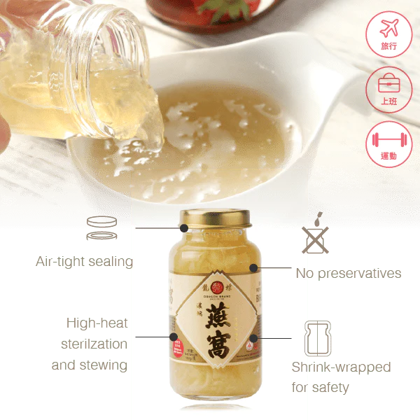 Dragon Brand's bottled bird’s nest is entirely cooked and sterilized with high heat and high pressure, without the use of preservatives.